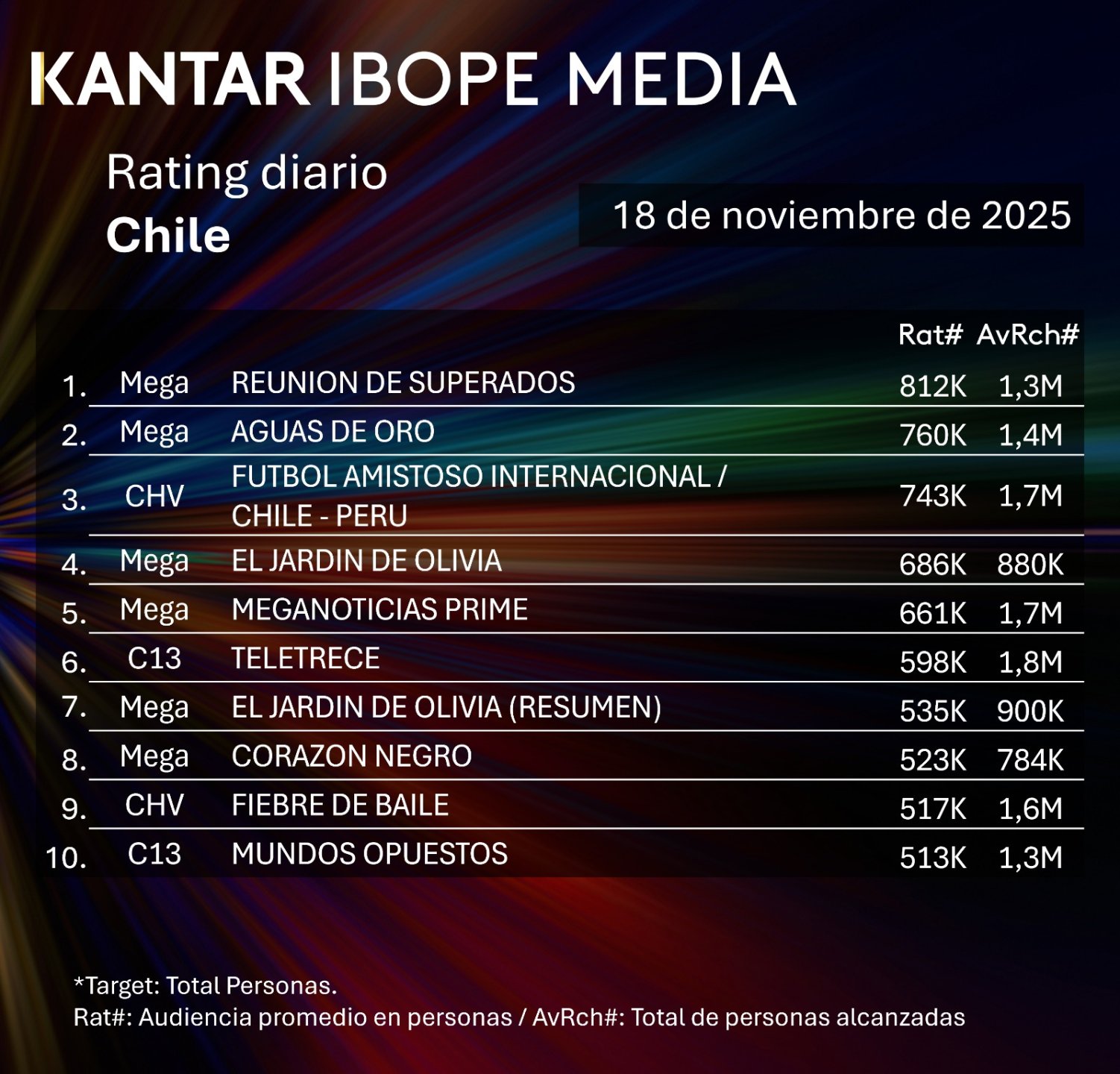 “Reunión de Superados” encabezó la lista de los programas más vistos del 18 de noviembre, seguido por “Aguas de Oro” y el amistoso Chile–Perú.