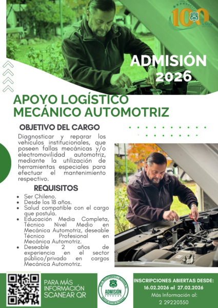 Carabineros de Chile abrió proceso Nacional de postulaciones para cargos de Apoyos Logísticos, los cuales son para formar parte de la Planta Institucional en diversas áreas tales como: Auxiliar de Almacén, Conductores de Vehículos, Garzón, Mantención de Cuarteles, Mecánico Automotriz y Rancheros; todos ellos ya disponibles para concursar a través de la plataforma postulaciones.carabineros.cl.