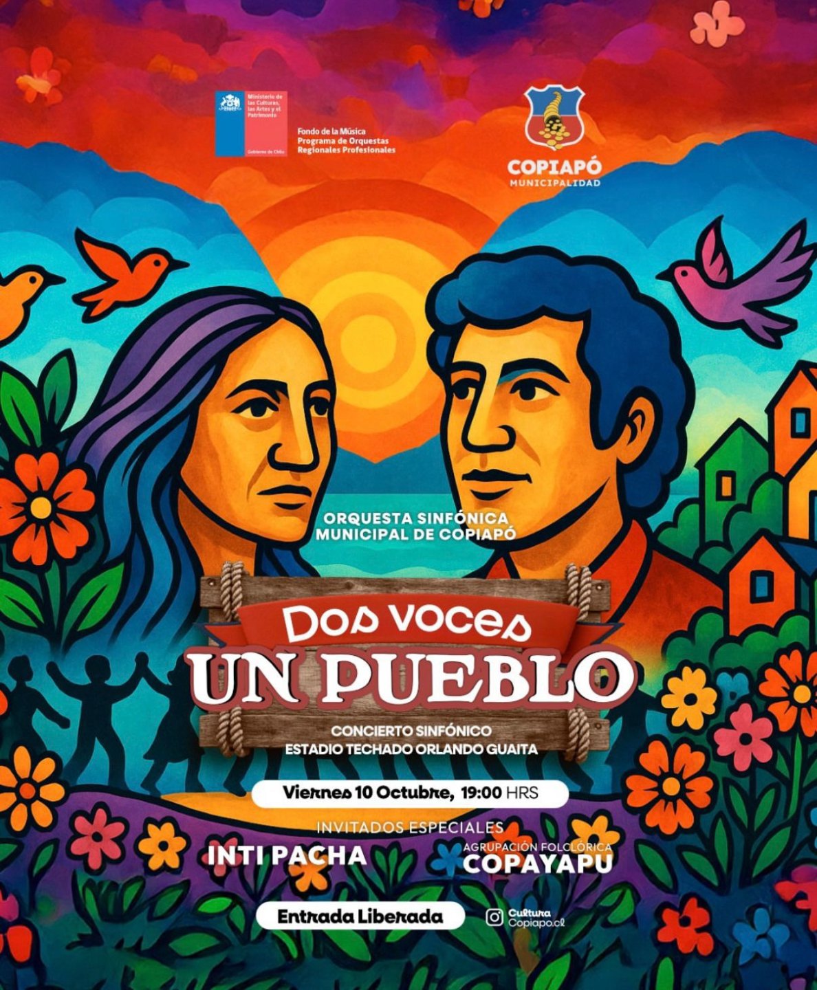 La Orquesta Sinfónica Municipal de Copiapó, junto a IntiPacha y la Agrupación Folclórica Copayapú, fusionarán música sinfónica, tradición andina y danza folclórica este viernes 10 de octubre, a las 19:00 horas, en el Estadio Techado Orlando Guaita.